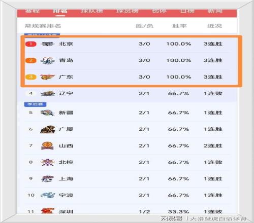 開局取得3連勝的球隊有3支,分別是北京隊、青島隊和廣東隊,三支球隊目前高居排名前三位;