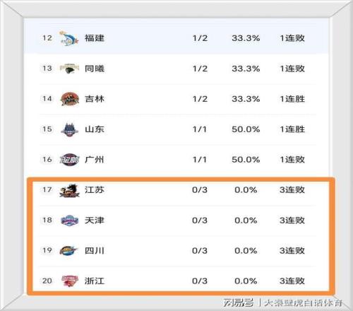 江蘇隊、天津隊、四川隊以及浙江隊,4支球隊都是開局3連敗,至今未嘗一勝,尤其是浙江男籃,作為上賽季的季后賽球隊,新賽季開賽以來排名墊底,確實令人大跌眼鏡。